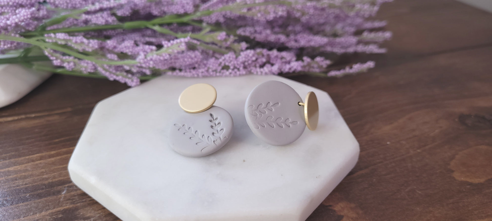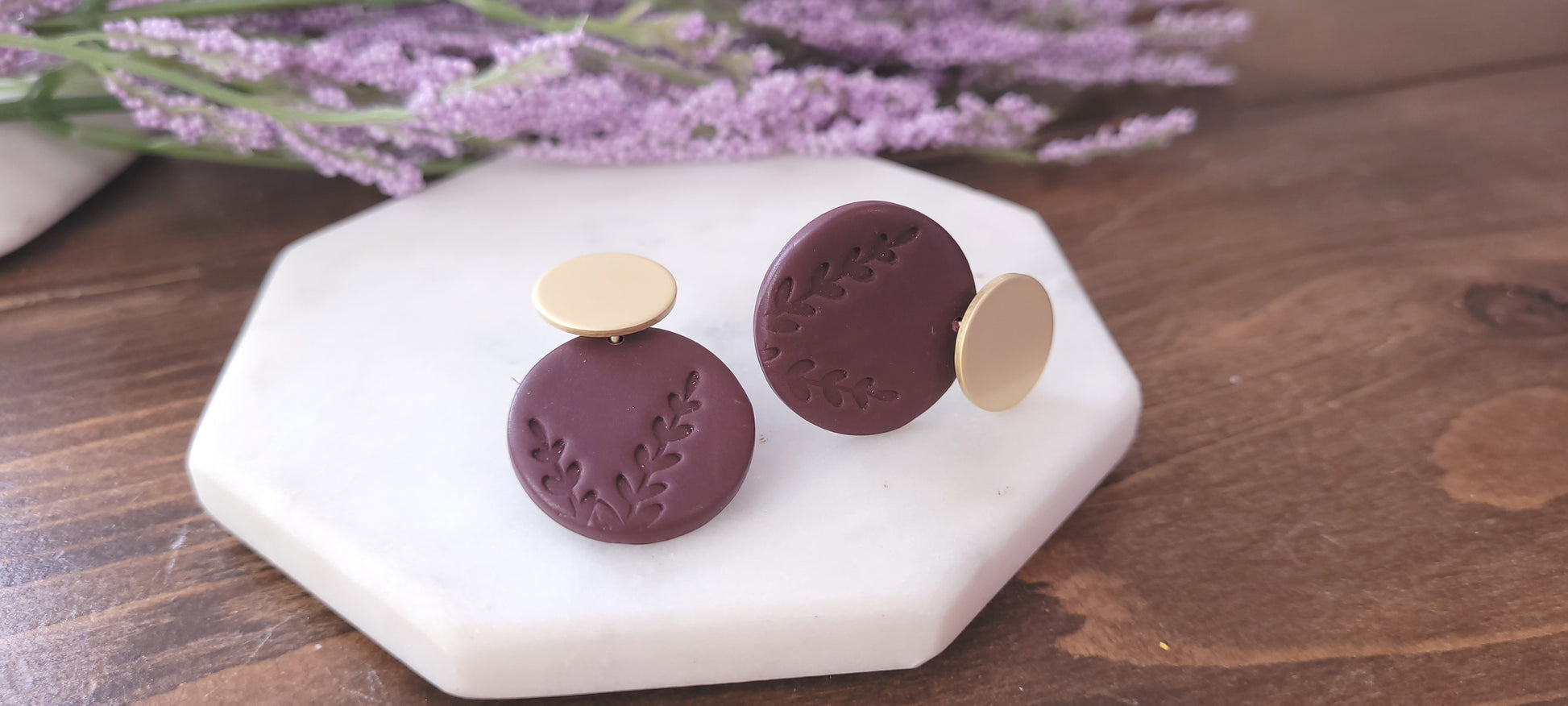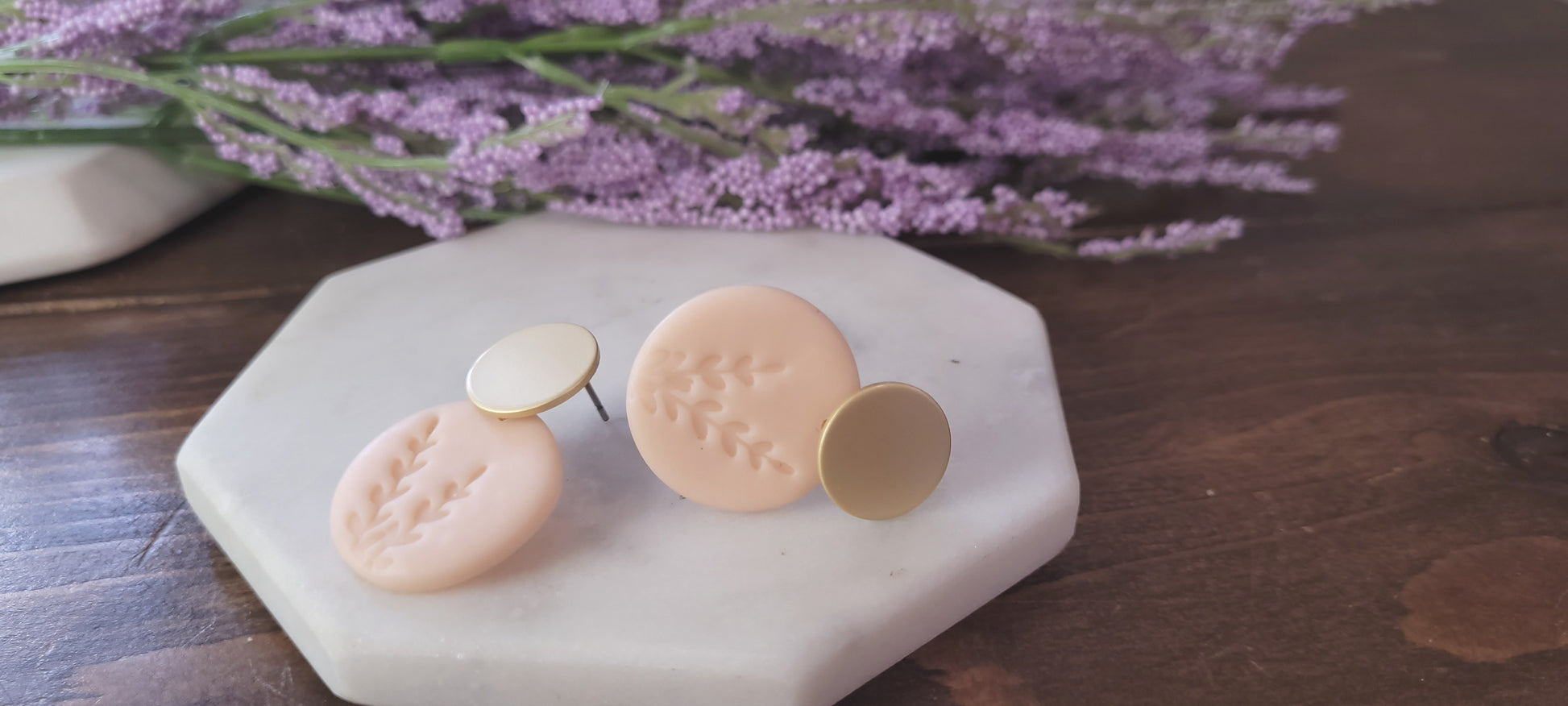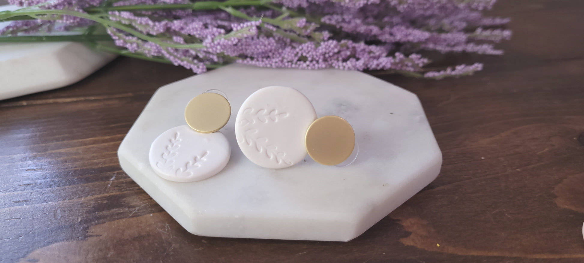A new twist to the original favorite. These are made with polymer clay with two fern embossed into each circle. Hardware has options of matte 18k gold plated 14mm circle with post, or open 15mm circle with 18k gold plated. Gold plated will keep hardware from tarnishing and all materials are made with hypoallergenic nickel and lead free metals